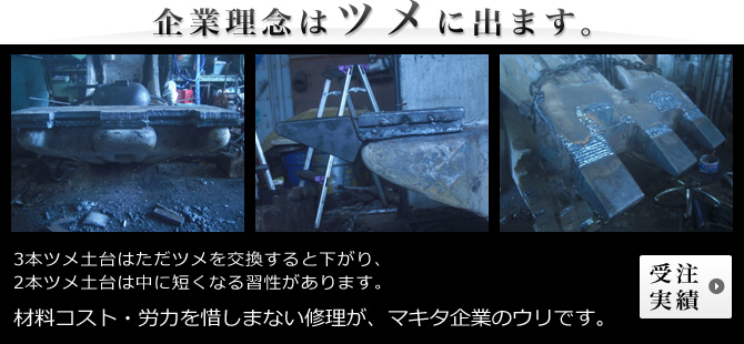 有限会社マキタ企業のウェブサイトにようこそ。マキタ企業では、総合解体業を お客様とする 解体機械(建機アタッチメント)などの重量機械を自社工場で修理しております。 他社では真似のできない長年の確かな技術力と経験で、重機(ショベル100tクラス)用のアタッチメントまで全メーカー修理、レンタル(リース)を承っております。